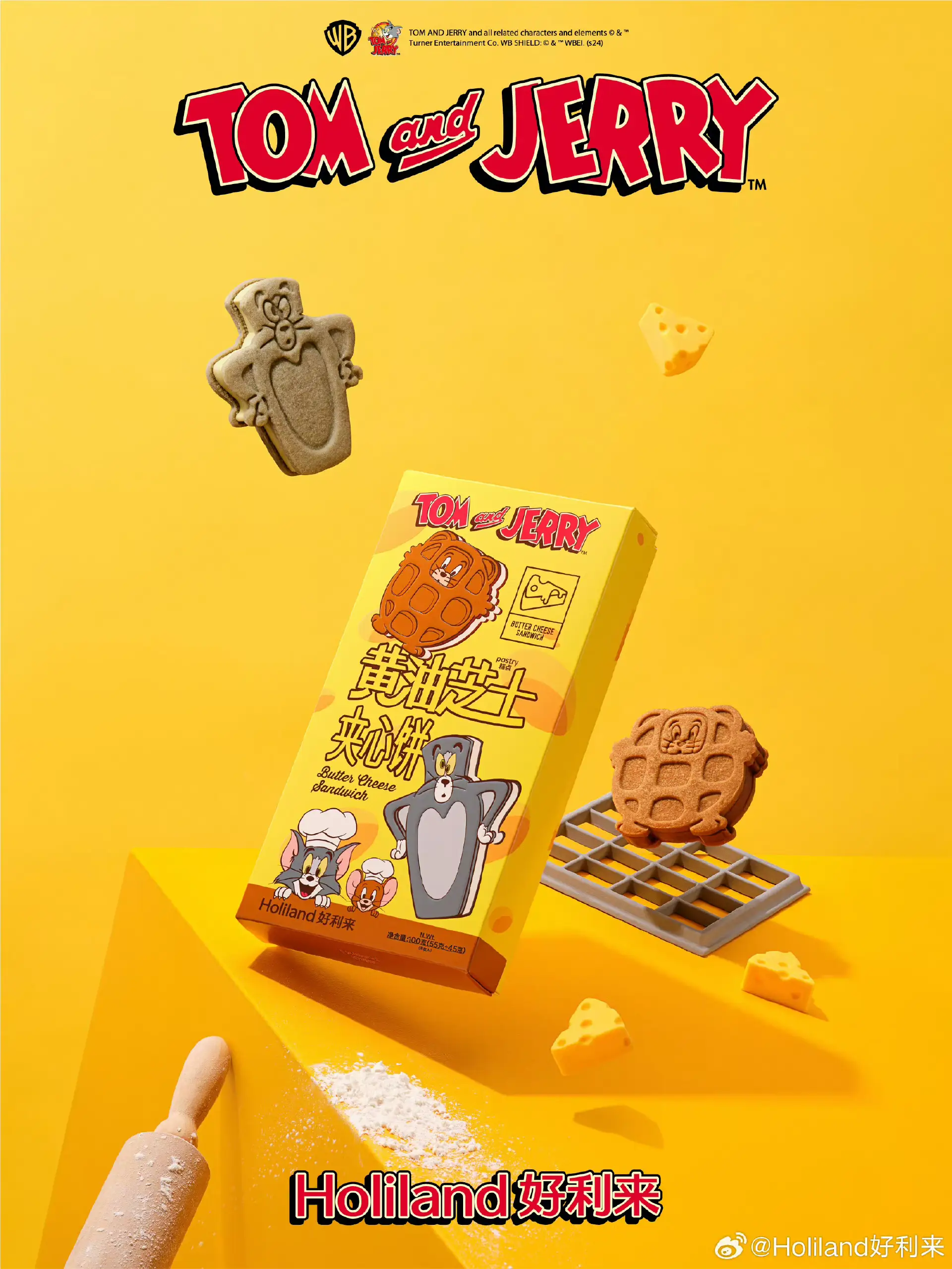 继七夕联名后,近期好利来再度携手《猫和老鼠》带来了第二波联名产品:『黄油芝士夹心饼』和『杰瑞的奶酪蛋糕』。