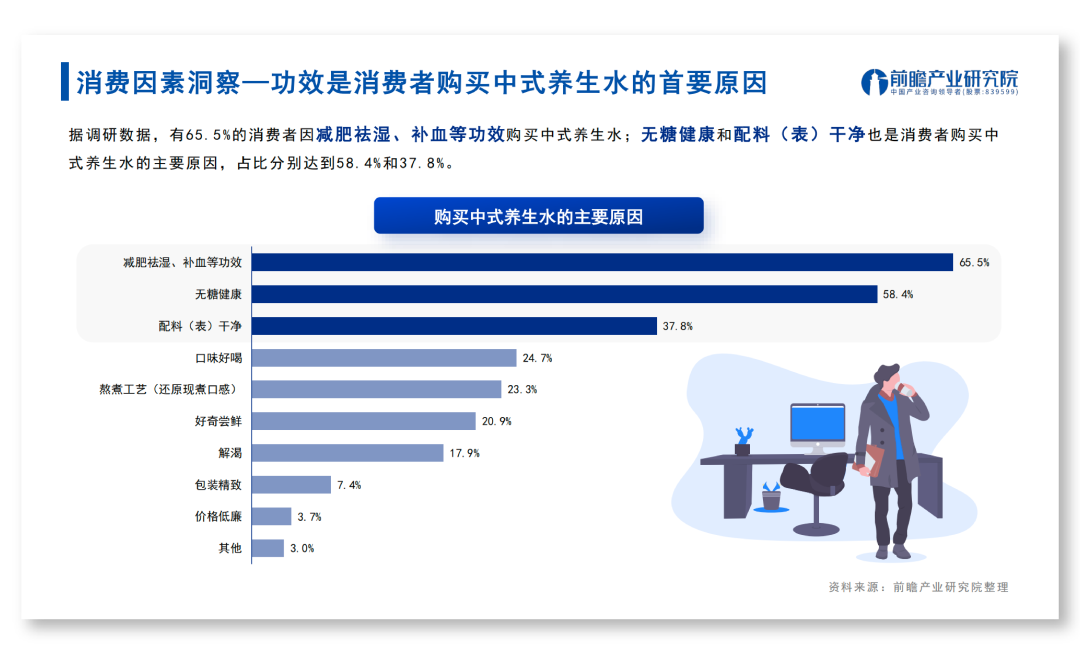 前瞻产业研究院的一份报告中也指出,消费者购买中式养生水的第一大原因就是看中了减肥祛湿、补血等功效。加上国人对于“药食同源”信手拈来,中式养生水便丝滑切入养生饮品赛道。