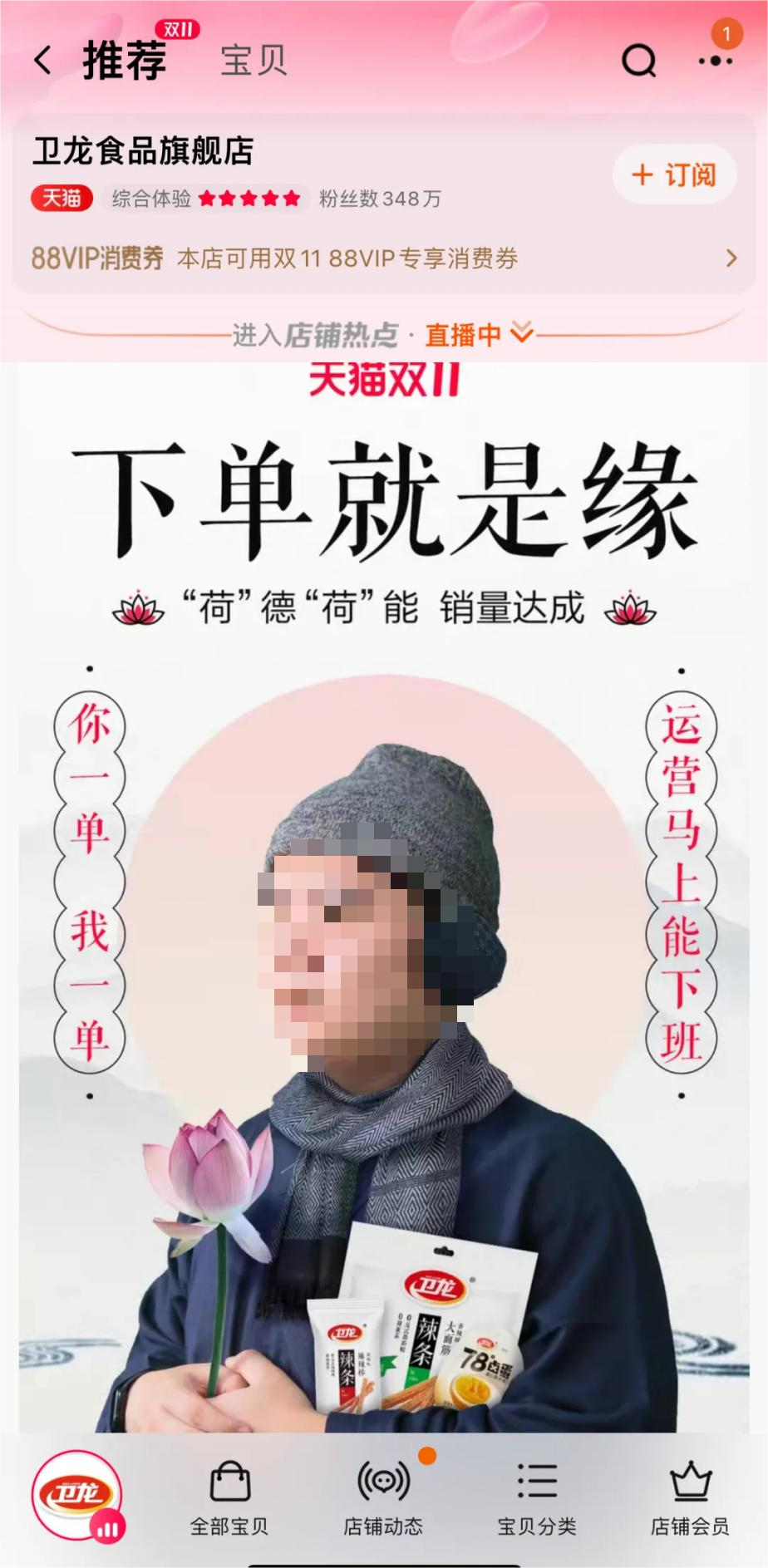 在之前双十一各个商家都在想尽办法如何提升销量的时候,卫龙打出“下单就是缘”、“荷德荷能,销量达成”的名号。
