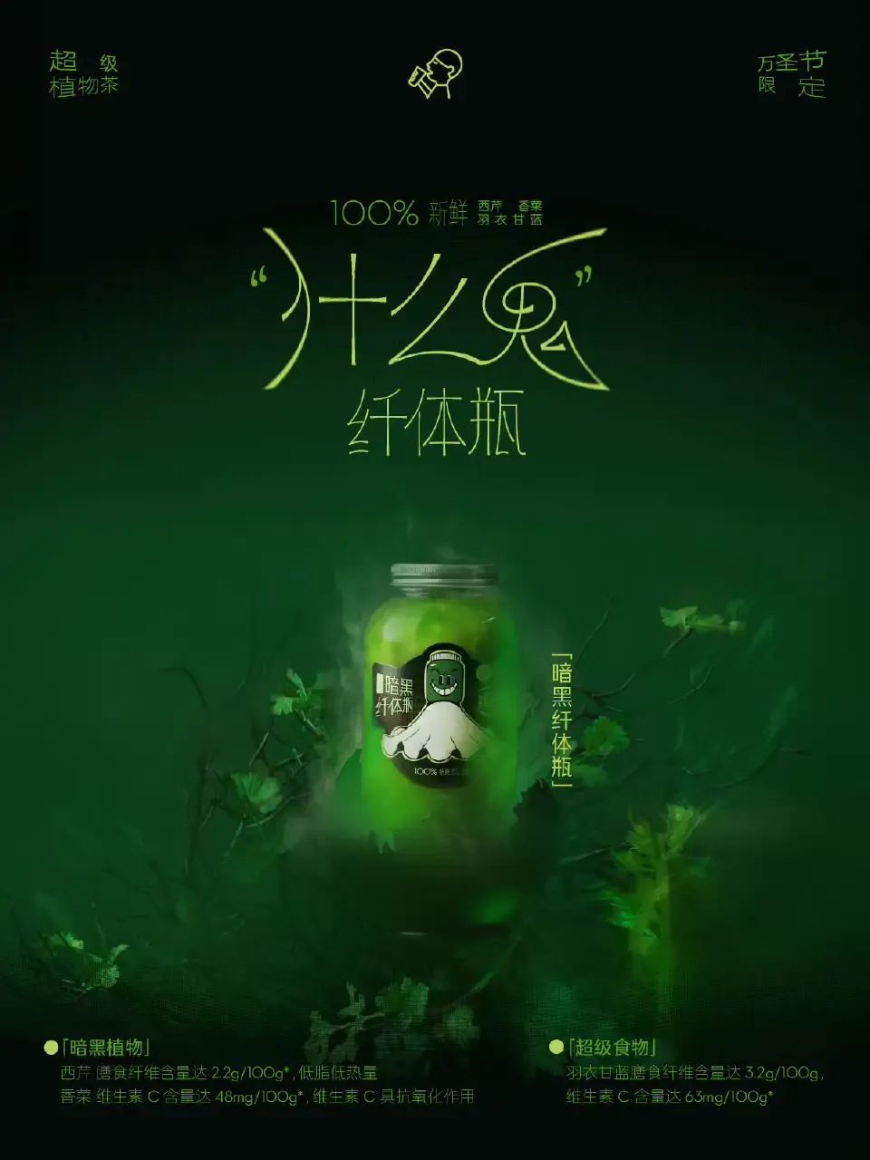 这一次,喜茶将这两种『暗黑』食材与超级植物羽衣甘蓝的灵感结合到一起,以三种植物纤维的奇妙碰撞,开启今年的万圣节『暗黑纤体瓶』挑战!