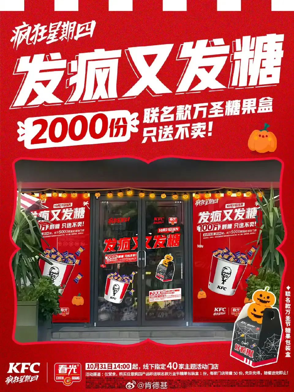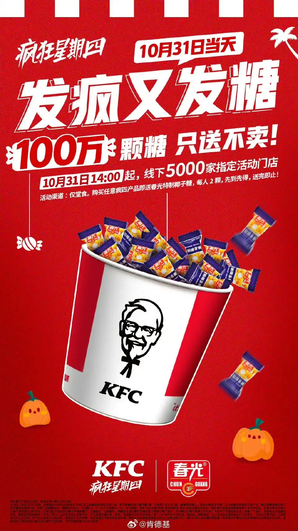 万圣节当天(星期四),肯德基携手海南春光食品,在全国范围内的5000家门店狂撒 100 万颗糖!