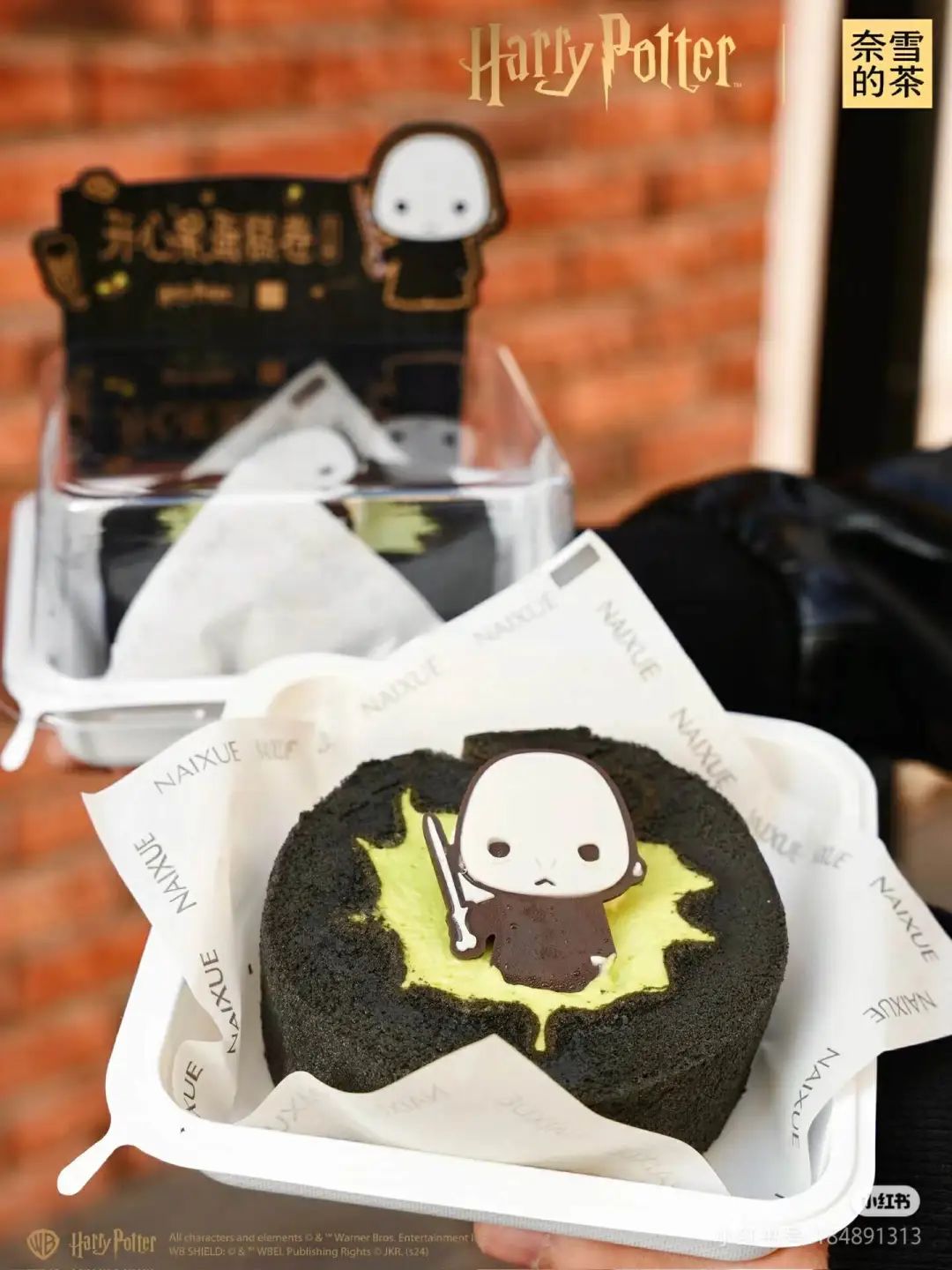 伏地魔Q版巧克力块,赋上一层浓郁可可“黑魔法”;炭黑蛋糕胚,如黑巫师的长袍;包裹着以伏地魔所属的学院色为灵感的开心果奶油,联动细节很有心意!