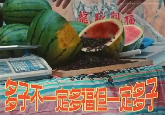 两个人在瓜摊买瓜,摊主说保熟保甜,切开之后,里面全是乌黑锃亮的瓜子。