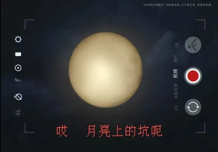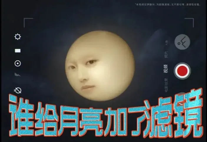 相机正在拍月亮,为了拍的更清楚,拉近了焦距,女生问:诶月亮上的坑呢?