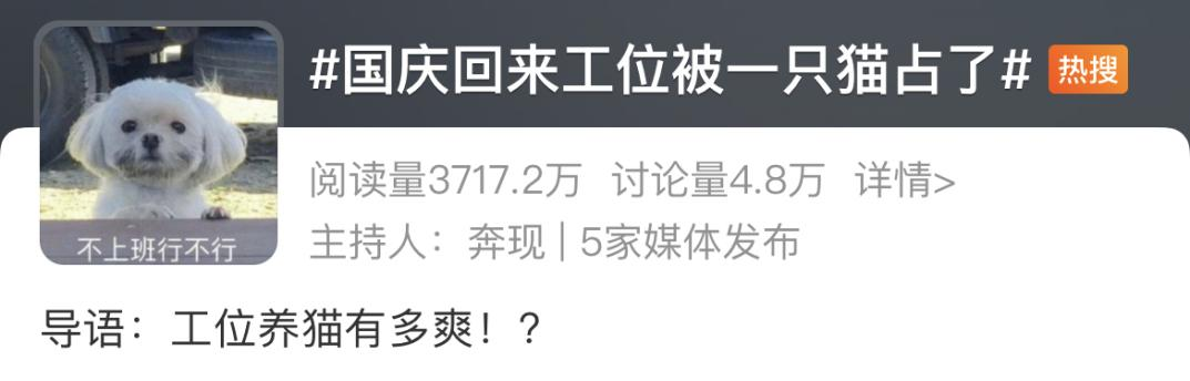 于是在杰士喵的IP热度加持下,“领养一只猫”上线一周即售罄,话题 #国庆回来工位被一只猫占了#更是在微博上引起3717.2万人浏览。