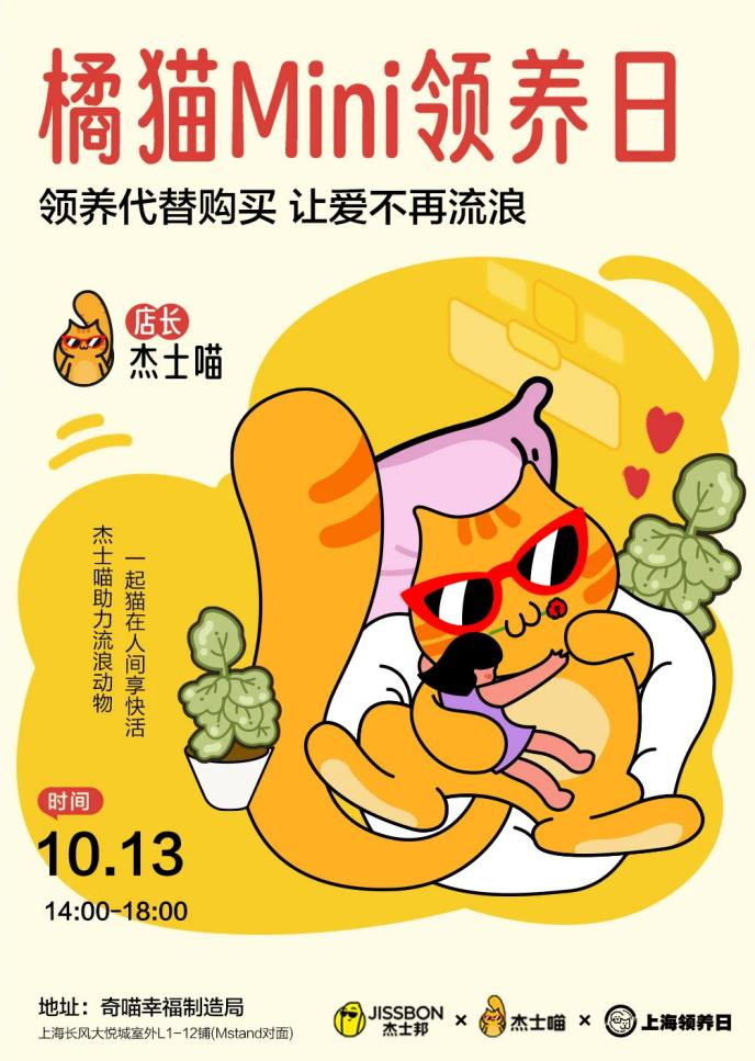 10月13日,杰士邦还与奇喵幸福制造局合作“上海领养日”,发起【橘猫Mini领养日】活动。杰士喵作为当日的店长,与来往的人们互动,一起帮助橘猫找到温暖的家。