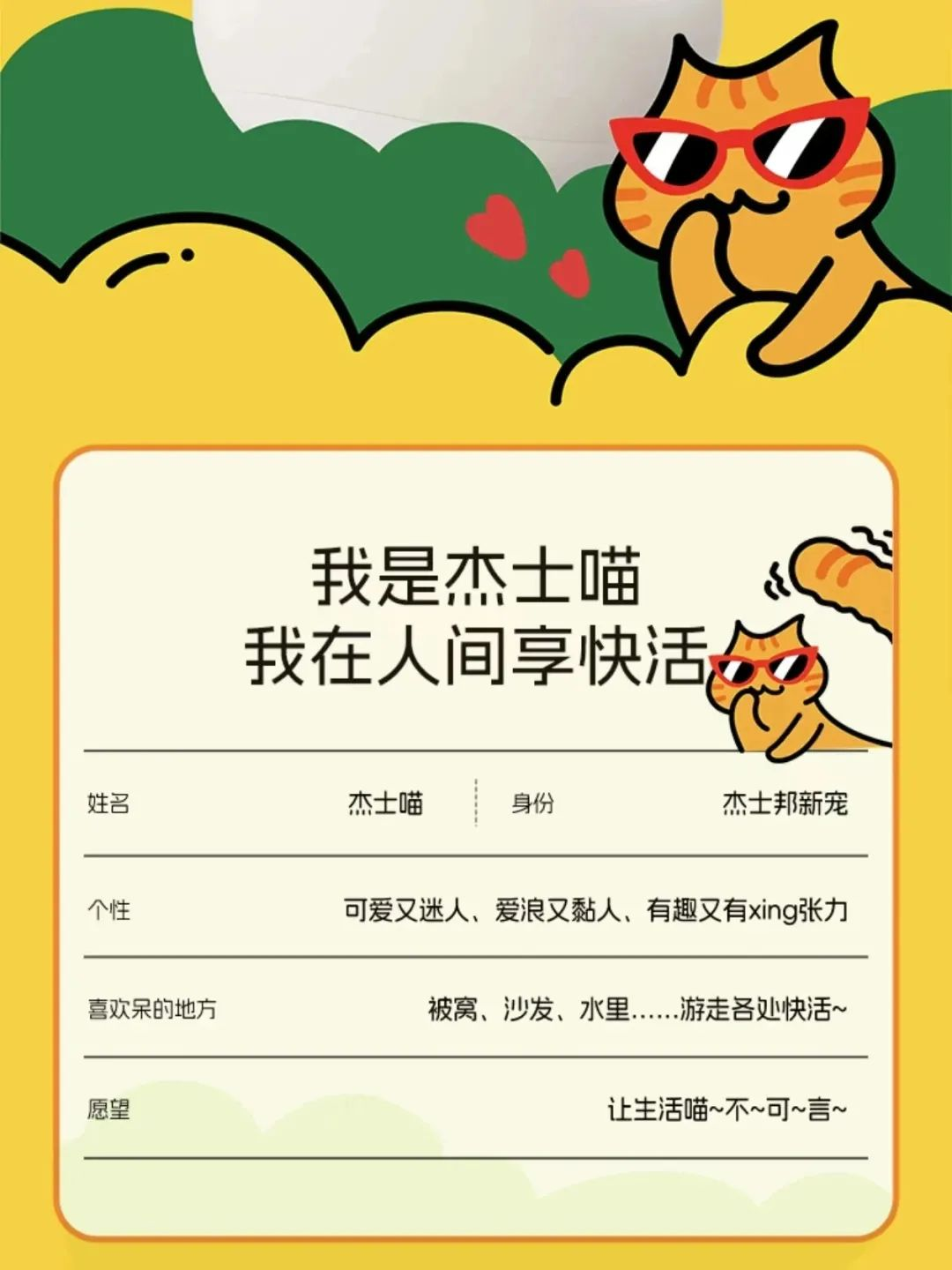 而且“杰士喵”不仅长得招人喜欢,性格也很潇洒——猫格“猫在人间想快活”。一整个个性鲜明的猫咪形象活脱脱跃然纸上,试问这样有趣又可爱的小猫咪,谁能不爱?