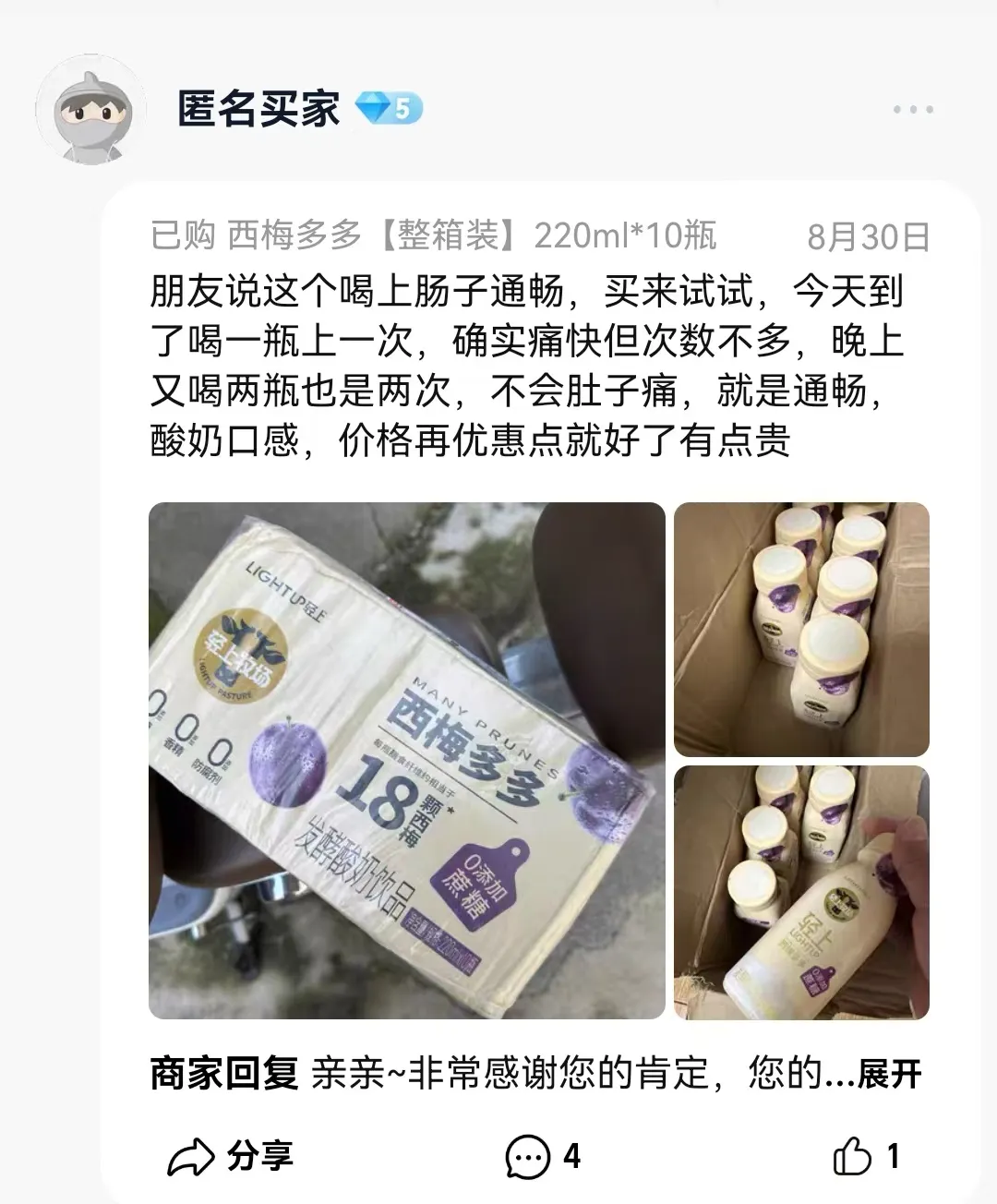 “朋友说这个喝上肠子通畅,买来试试。”2024年8月,在轻上天猫旗舰店“西梅多多”商品评价区,一位匿名买家分享了购买理由。查看评价区,不难发现,认为西梅多多“适用于通便场景”而消费的买家,不在少数。
