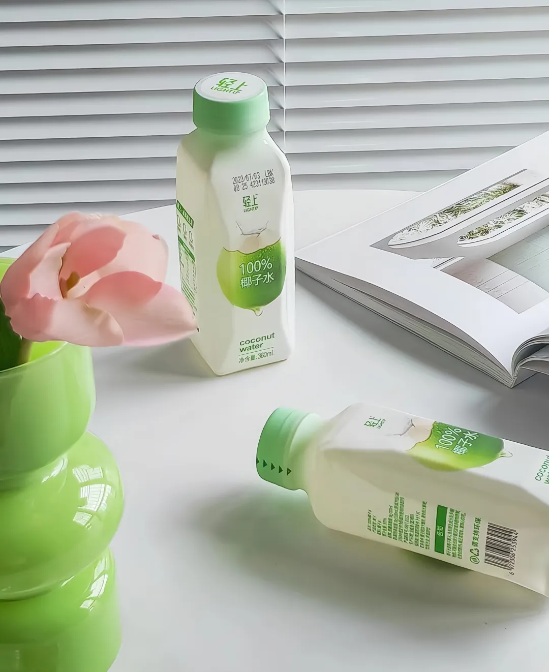 而轻上在上线100%椰子水时,同样采用了白绿相间的包装风格,占据视觉中心的也正是一整颗的椰子形象。
