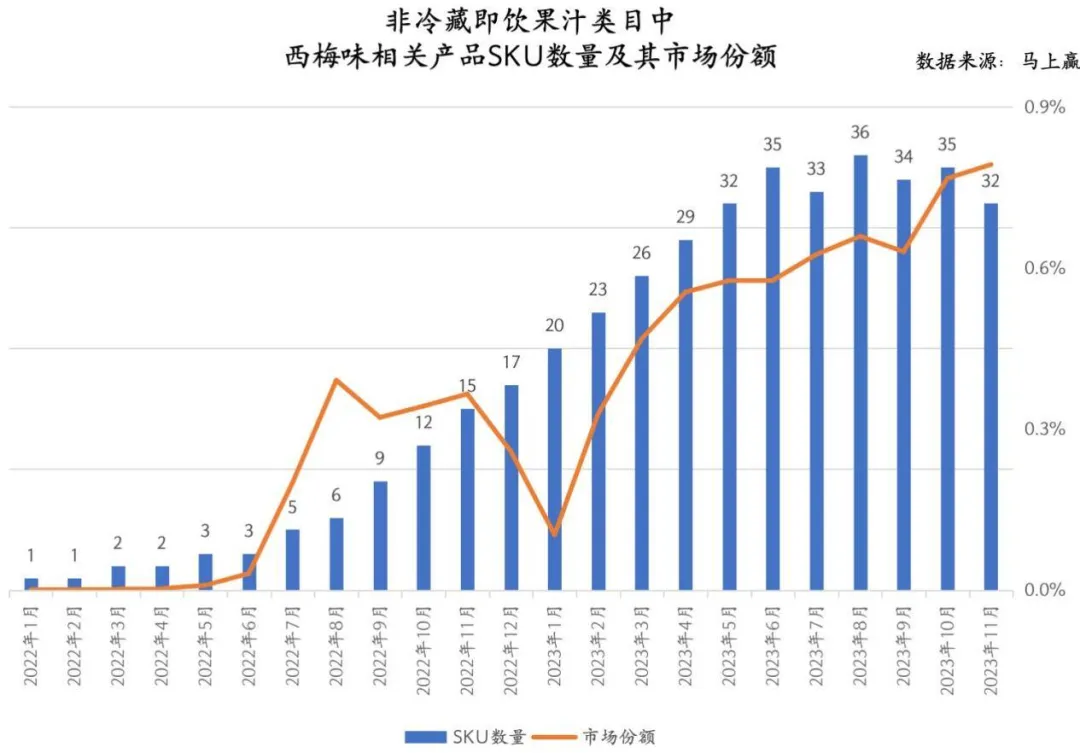 2023年1月轻上进入西梅汁品类之际,西梅汁增长势头已起。马上赢数据显示,2022年1—12月期间西梅味产品市场份额、SKU数量出现明显增长,产品表现走向活跃。