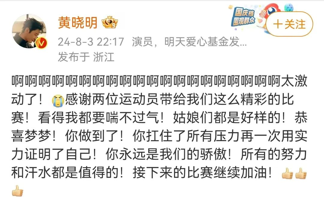 众所周知,陈梦有一个在娱乐圈的哥哥——黄晓明,当初在巴黎奥运会的决赛上,黄晓明是少数自始至终相信、鼓励陈梦的“粉丝”。