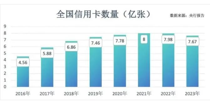 谁能想到,曾是中产标配的信用卡,竟有“失宠”的一天。据央行最新发布的报告,2023年,全国信用卡和借贷合一卡为7.67亿张,相较于2022年的7.98亿张,蒸发了3100万张,降幅达3.89%,而这已是信用卡总量萎缩的第三个年头。