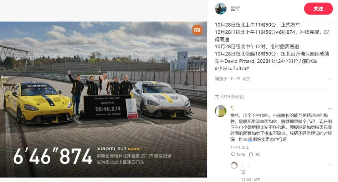 雷军庆祝小米SU7 Ultra原型车纽北战绩,网友列出卫生巾明确的用户需求,就差一个产品经理了。