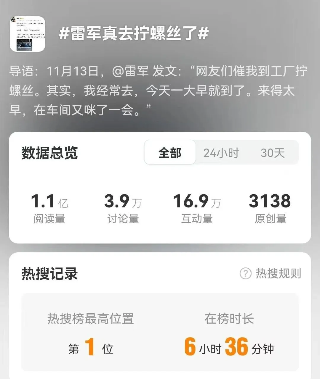 最近,“先天流量圣体”雷军又双叒上热搜了,#雷军真去拧螺丝了#冲上微博榜一,话题阅读量超一亿。