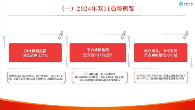 作为电商头部服务商,灵狐科技公司深知在瞬息万变的电商市场中,精准把握趋势、科学营销的重要性。因此,基于2024年双11战况,灵狐科技发布了《赢在电商--解读2024 年双11,洞见新机会》报告,报告内容融合各大品类厂商实战经验,总结京东、天猫、拼多多、抖音、快手、小红书等平台的双11战役情况,力求为电商雇主提供一份全面、深入、前瞻性的决策参考。灵狐科技希望通过此次报告,与业界同仁共同探讨电商营销的未来趋势,推动电商行业的持续健康发展,帮助电商品牌更好地理解市场变化,把握消费者需求,优化营销策略,提升服务质量,从而在激烈的市场竞争中把握先机,脱颖而出,打破流量围墙,吸引更多用户参与购物,实现销售业绩的飞跃。