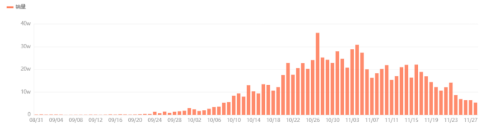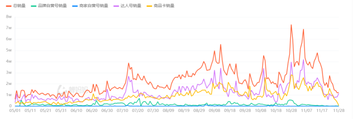 在众多商品中,运动户外品牌博舒健是指压板类目中排名第一的品牌。从蝉妈妈后台的品牌经营趋势分析看,5 月和 6 月博舒健的销量表现还比较一般,在 7、8 月的夏季减肥旺季,销量逐步增长,随着 9 月下旬天气转凉,品牌销量出现小幅下滑,但到了 10 月,销量就一路攀升。