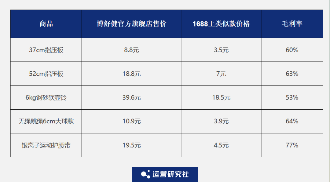 除了指压板,博舒健在抖音的热销商品还有之前抖音平台流行的壶铃、跳绳等运动器材,产品定价大多在 10-50 元,按照 1688 上类似商品的批发价格估算,毛利率基本在 50%-70% 。