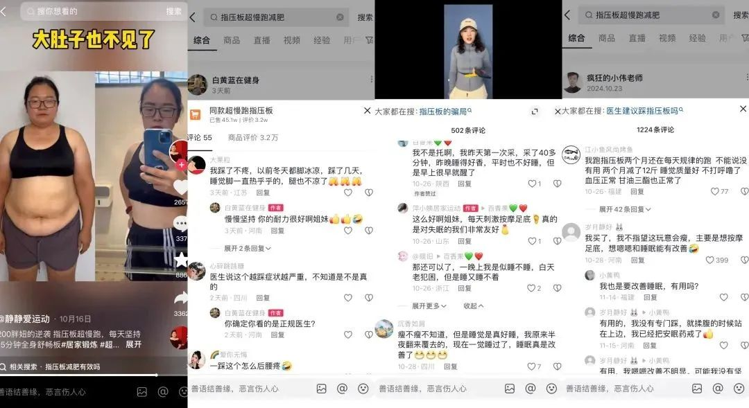 有博主发出前后对比视频,分享自己坚持指压板超慢跑 6 个月减重 60 斤。在一些视频评论区,还有用户分享,踩指压板改善手脚冰凉、失眠、便秘等问题。