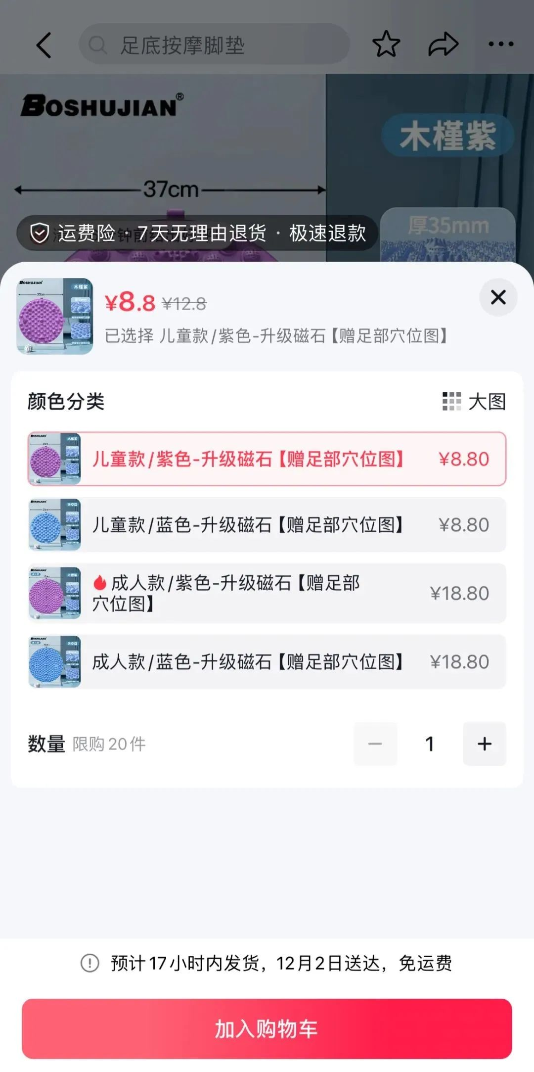 此外,为了突出指压板的足底按摩效果,博舒健的指压板还增加了 5 处磁石设计,消费者购买指压板还会免费赠送一份足部穴位图,潜移默化中让用户觉得指压板能按摩足底穴位,对健康有益,从而提高商品卡的转化率。