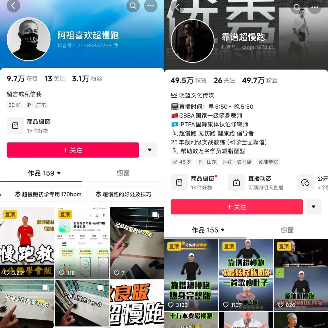 例如 @阿祖喜欢超慢跑 从 3 月开始陆续更新了大量视频介绍超慢跑的技巧、好处和跟练音乐,拥有49万粉丝的达人@靠谱超慢跑 则在今年8月开始发布超慢跑相关内容。