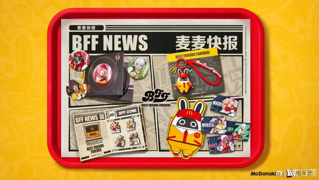 此次联动套餐包括:『BFF友谊麦岁』爆闪银葱吧唧套组、限定金属徽章套组、限定钥匙扣、限定镭射票组、联动邦布包装袋。