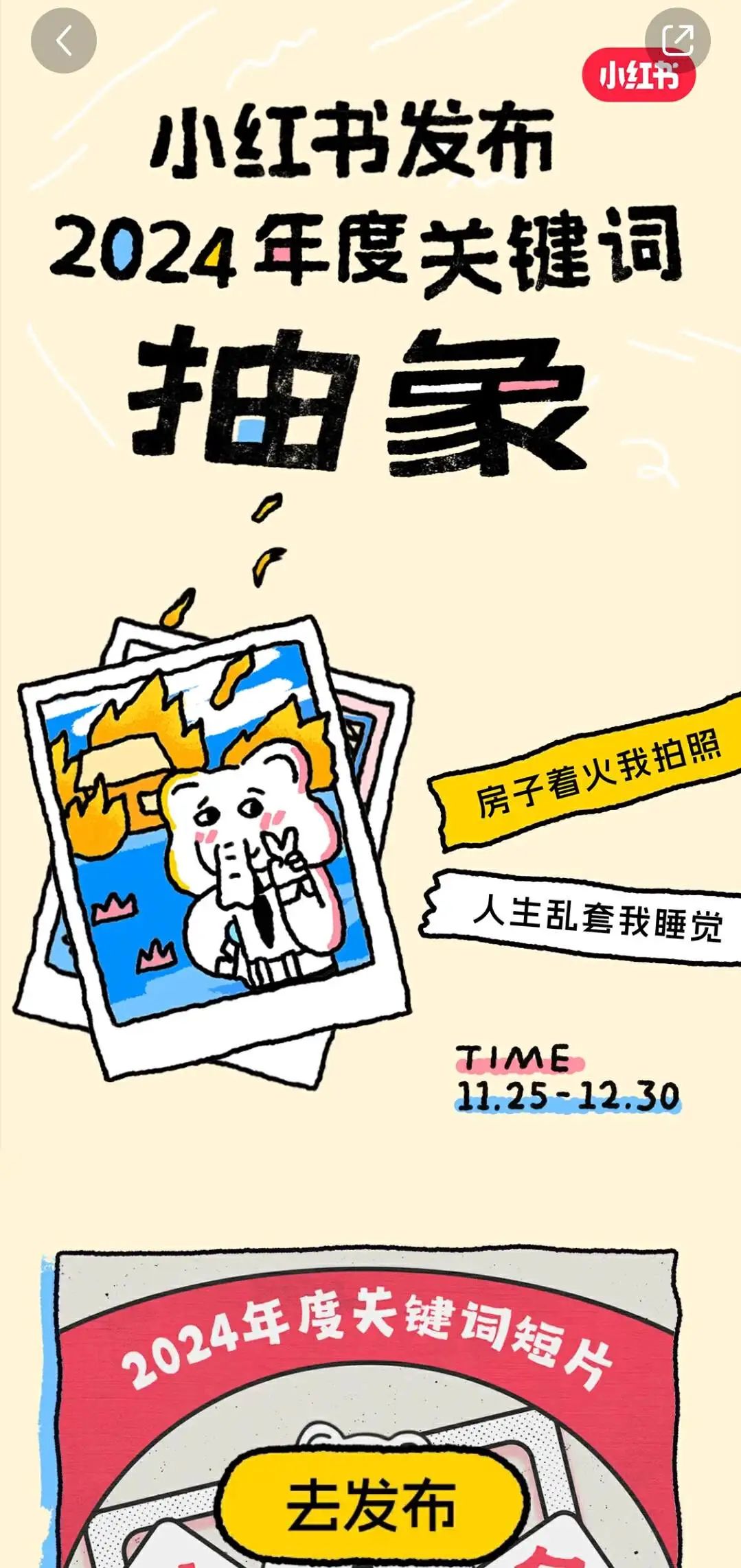 最近,小红书综合社区内的用户笔记、阅读量和评论互动等指标,发布了2024年度关键词——抽象。这一关键词的发布,反映了当代年轻人在网络和现实生活中的一种特殊的文化现象和生活态度。