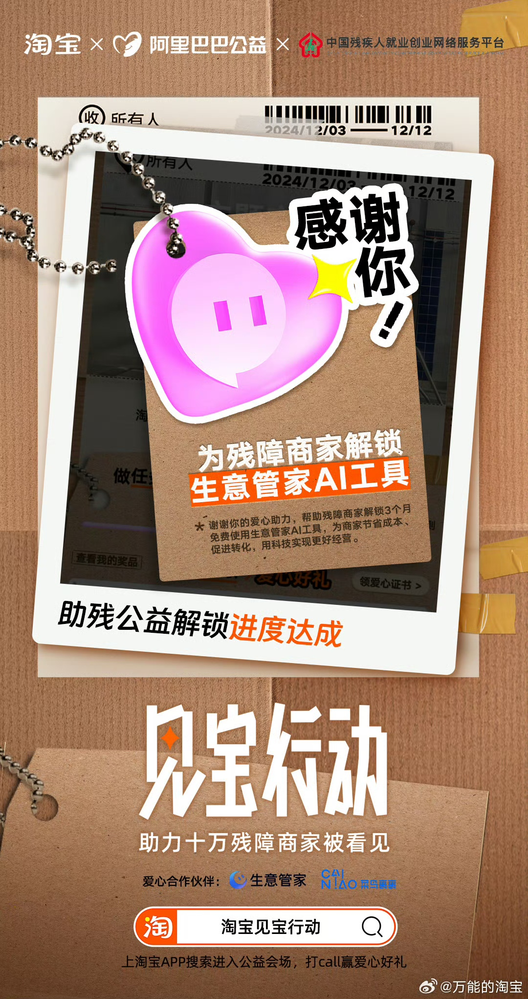 在12.3国际残疾人日来临之际,淘宝携手阿里巴巴公益、中国残联就业服务平台发起公益行动,旨在帮助淘宝超10万残障商家被更多人看到和关注,保障中小残障商家的权益。