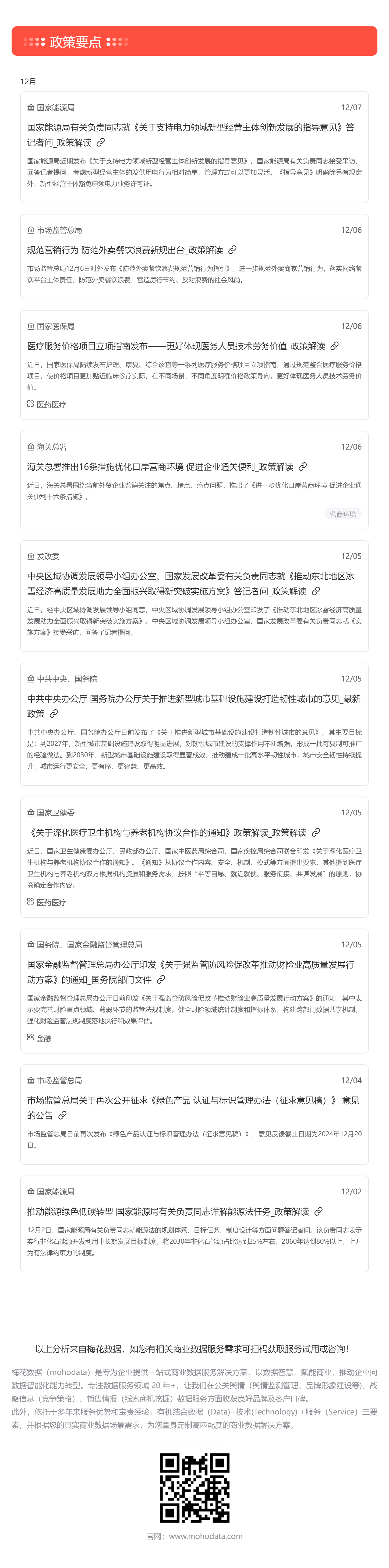 根据梅花数据舆情监测要政盘点统计,监测期间共收录重要政策信息共计59条,其中涉及城市建设、医疗、环保、进出口等多个领域,建议重点关注《促进企业通关便利十六条措施》、《绿色产品认证与标识管理办法(征求意见稿)》等政策。