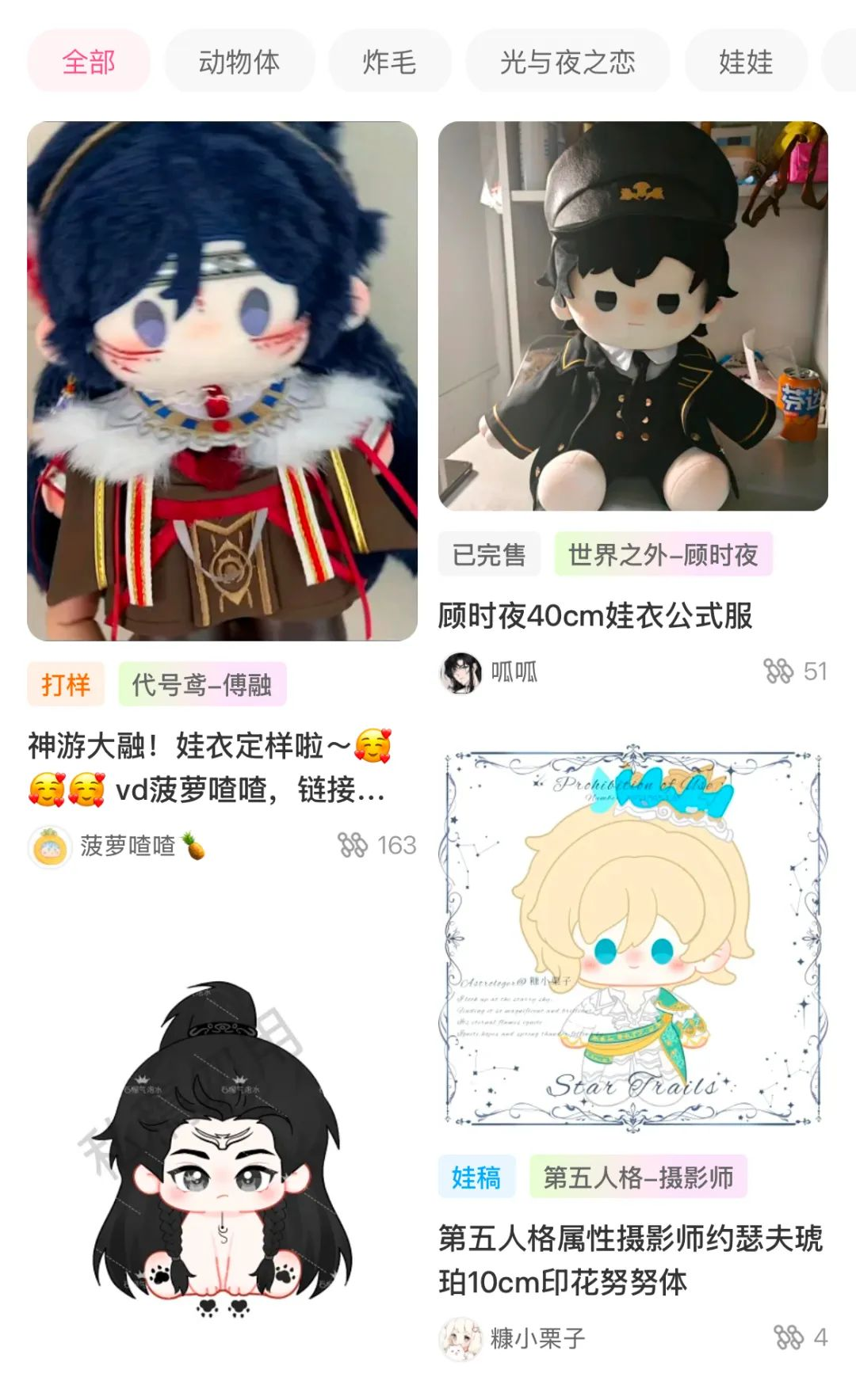 2019 年前后,随着国内文创产业和潮玩市场的升温,一批棉花娃娃爱好者开始投入到相关设计、制作和销售中。与此同时,棉花娃娃也逐渐从明星饭圈向影视动漫、游戏等兴趣圈层延伸,娃娃的类别也不断拓宽。