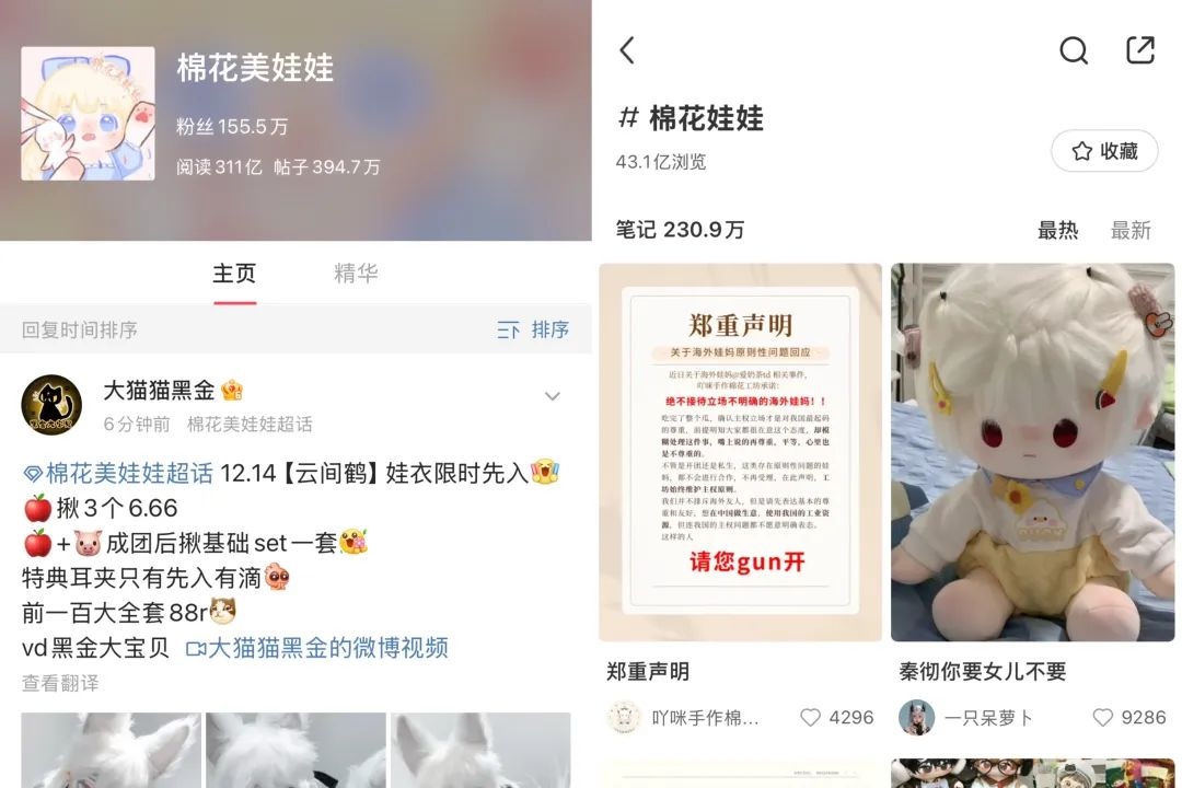 从 2020 年下半年开始,微博超话“棉花美娃娃”便长期占据“潮物”类前列。截至目前,该超话有 155.5 万粉丝,发帖数近 400 万,阅读量超过 310 亿。在小红书上,话题#棉花娃娃 的浏览量也已超过 43 亿,火热程度可见一斑。