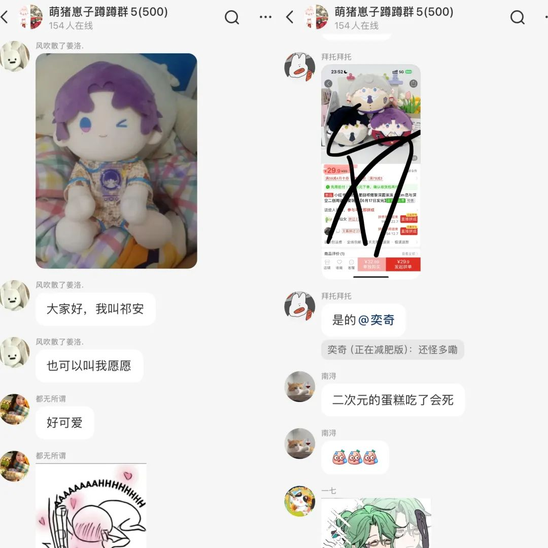 在群聊中,群主会及时发布新品资讯、促销活动、发货时间等信息,其他用户也会在群聊提醒大家认准店铺,避雷“盗版”商家,收到娃娃的玩家也会带图分享,介绍自家“宝宝”的名字。