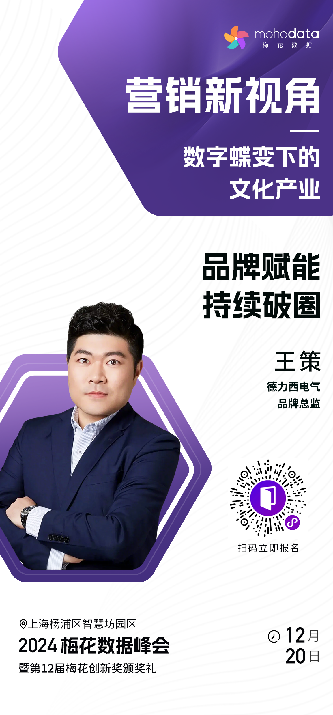 本届梅花数据峰会将于2024年12月20日在上海杨浦区智慧坊园区多媒体会议中心举办。我们邀请到了诸多业内资深人士参与并发表主题演讲,期待您前来现场与梅花之友共同就数字科技、文化传播、营销创新等行业领域进行深度讨论和交流。点此即刻报名:https://hdxu.cn/n04h