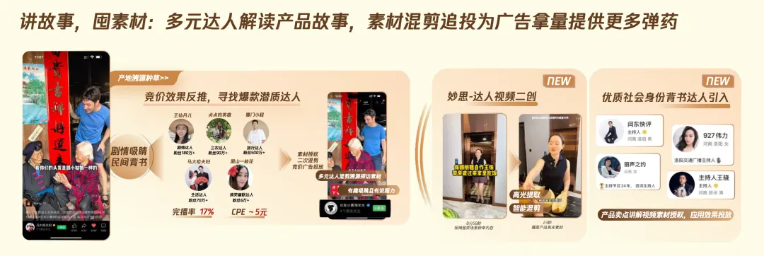 有白牌投放后发现,真人演绎的素材远比口播硬聊的素材效果更好,鉴于白牌储备的演艺人员有限,无法大批量产出真人视频,该品牌选择和互选达人进行合作,寻找同样一些有爆款潜质的达人进行产地溯源等内容的拍摄,不仅完成了本身的种草,也为品牌储备了丰富的素材。