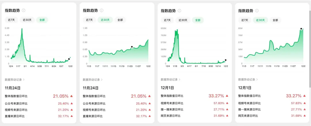 微信指数显示,“过年”“年货” 等关键词在过去30天逐步提升,“过年” 一词的整体指数环比增长21.05%,“年货” 一词同比增长33.27%。而将时间线拉长到一年便会发现,“过年”“年货” 这类春节节庆关键词的热度会逐步提升,在过年之后才开始回落。