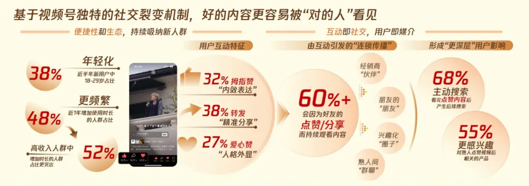 在视频号,用户的分享、爱心赞、拇指赞都有机会将互动的视频推到好友面前。数据显示,60%的用户会因为好友的点赞分享而观看内容,这让视频号的内容能够更好地实现连锁传播。
