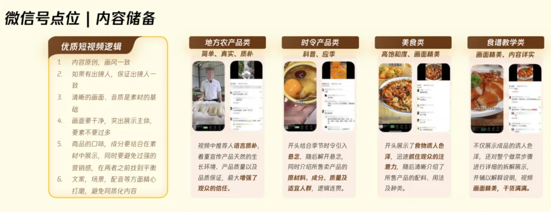 “首先是地方农产品类。简单、真实、质朴的内容可以极大地增强观众的信任。而对于时令产品类的内容,科普和介绍的内容需要详细地展开所售卖的商品的原材料、成分、质量和适宜人群,能够获得更好的数据。而对于美食类的内容,除了展示食物诱人的色泽来抓住观众的注意力,还要详细介绍所售商品的配料、用法及种类。对于食谱教学类的内容,不仅要展示成品的诱人色泽,还要对整个做菜步骤进行详尽的拆解并辅以说明。”