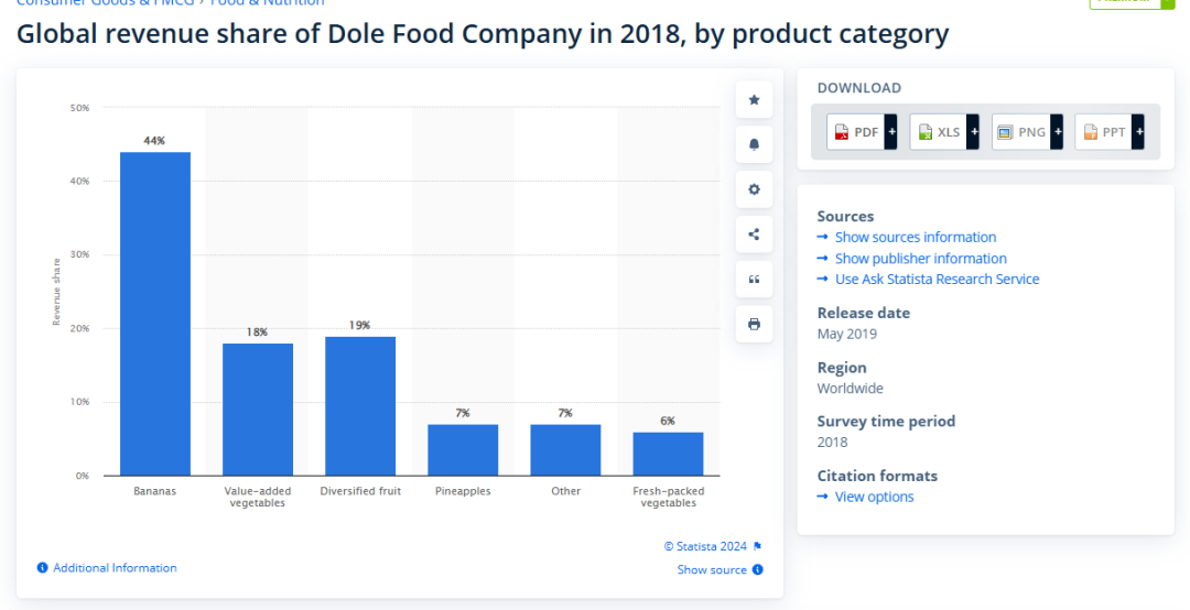 其实都乐也卖苹果、猕猴桃、牛油果,但都没卖出什么水花。都乐这么宝贝香蕉、菠萝这两个大单品确实是有理由的:2018年时,都乐的香蕉占据总它全球营收的44%,菠萝则占了7%,两者加起来包揽了大半个都乐。
