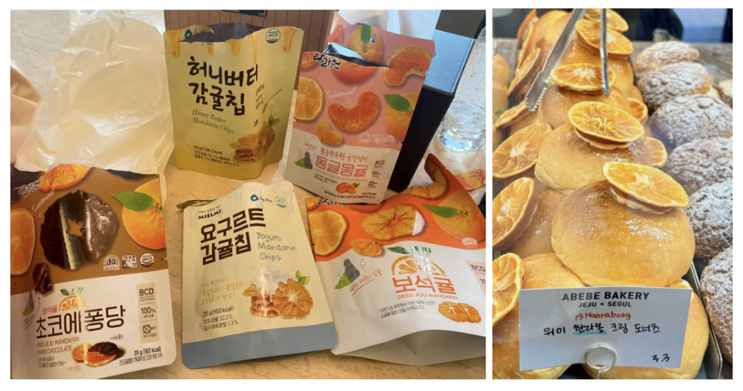 光是济州岛产的包装橘子干产品,就有五六个不同品牌,分为片状橘子干和瓣状橘子干,酸度、黏牙度,以及口味都多种多样,包括原味的、加蜂蜜的、加酸奶的橘子干。而橘子干的现制衍生品就更多了:橘子干巧克力——在干橘片外裹上薄薄一层巧克力外衣,以及把一片橘子干涂上奶放置在面包上的橘子干面包,毫无技术含量、全是社交属性。