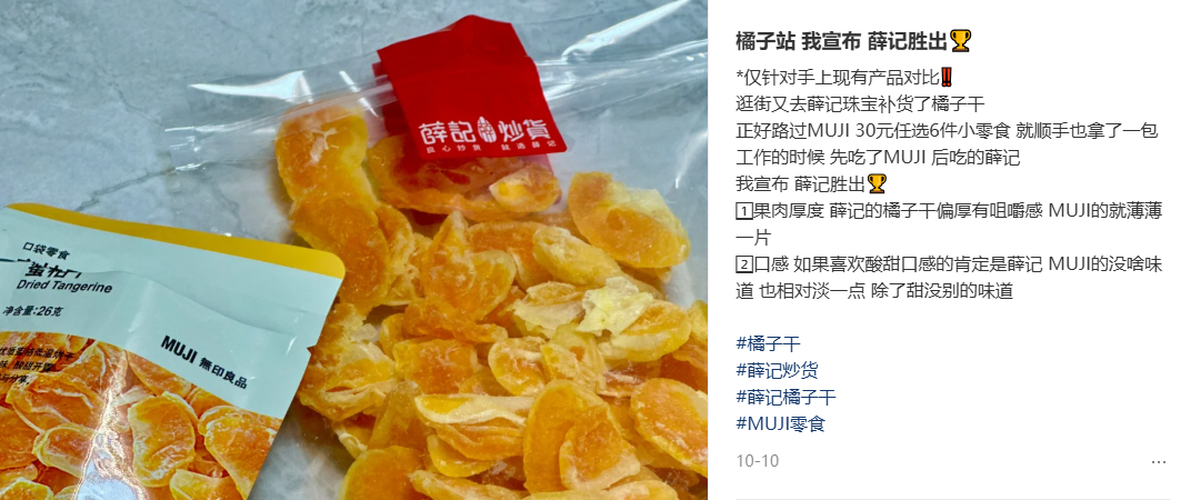 除了做成果干,你找不出第二个如此简单无门槛的让橘子身价翻倍的方法,于是从做炒货的、做奶茶的到做日用品的——薛记炒货、裕莲茶楼、无印良品都纷纷推出了自己的橘子干。