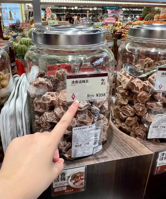 “月薪三万不敢买”、炒货卖成黄金的薛记,把各色果干当头牌,摆在店里最显眼的位置上,最便宜的一袋杏干贵过一斤牛肉。上个月,有人去知名蜜饯品牌“么凤士多”的南京店买话梅干,称了两颗话梅,花了130。仔细一看标价“385元”背后的单位是“50g”,一斤话梅干要将近4000元,店员解释“因为话梅选用了罗光梅这种稀有品种”。