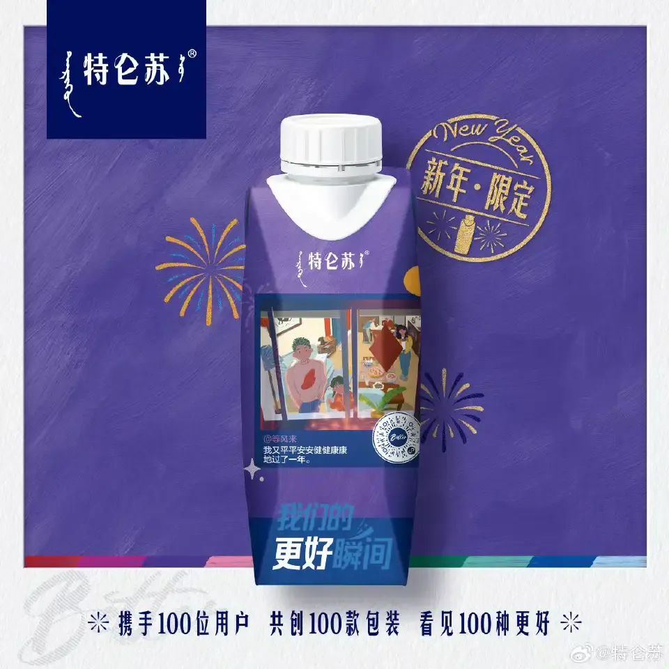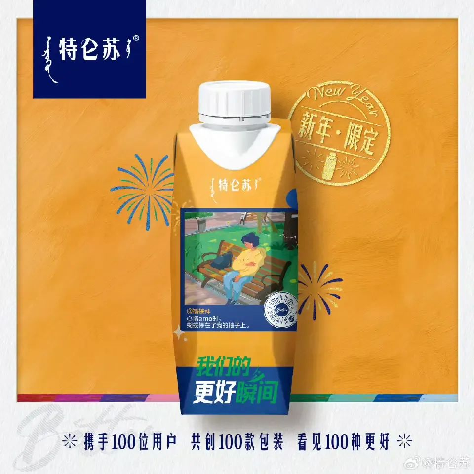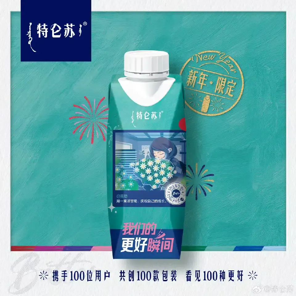 每年,特仑苏都会与易烊千玺一起聊起『更好』瞬间。而今年,有了更多人的加入,品牌收集了包括易烊千玺在内的100个用户的真实瞬间,由15位插画师创作成插画作品,共创出100款【特仑苏新年限定款】包装。