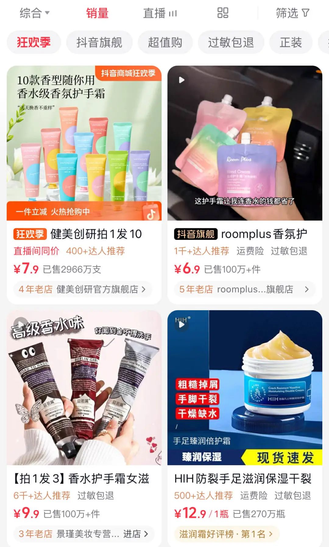 就算是代工,看到不到20元的价格你也会觉得挺有性价比。护手霜便宜到极限就是白牌遍地走,欧特欧数据显示,2021年9月抖音小店整体护手霜类成交均价为13.5元。