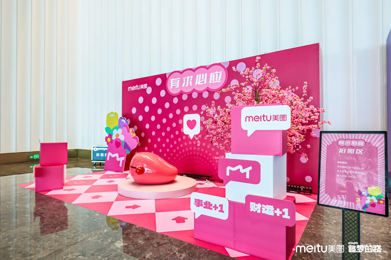在此次活动中,美图公司充分运用其标志性的品牌色彩,烘托年会氛围,巧妙地打造了多个极具创意的拍照打卡点,引来众多员工纷纷打卡。
