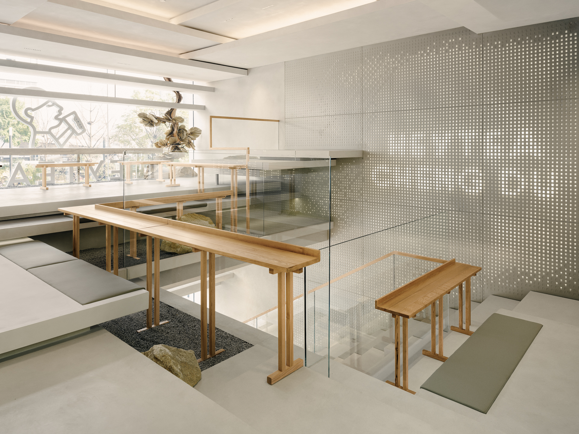 店内是浅灰微水泥搭配原木装饰的设计,显得十分质朴、克制、冷静。同时,店内还定制了植被装置,一棵崖柏倒悬空中,柔和的柏木香气,让人惊喜。