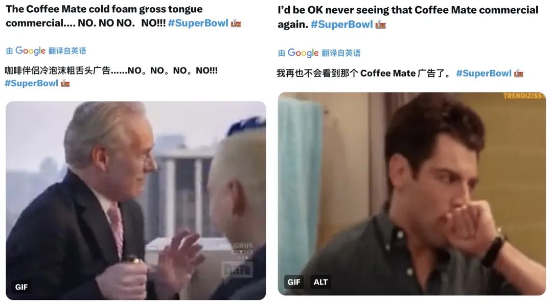 如果说前两支广告在内容呈现上走的还是正常路线,那么雀巢伴侣的超级碗广告就是单纯从画面上引人不适了。
