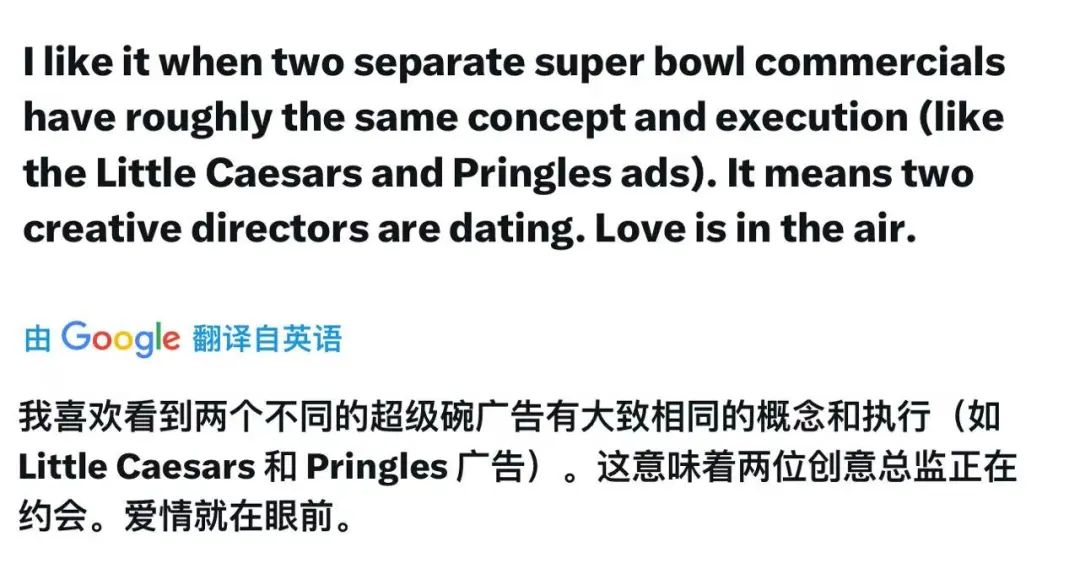 不考虑内容,更令人尴尬的一点是,Pringles 的广告在 Little Caesars 之后播出,当Pringles广告创意总监看到前者播出时,想必辞职书都已经打好腹稿了吧。