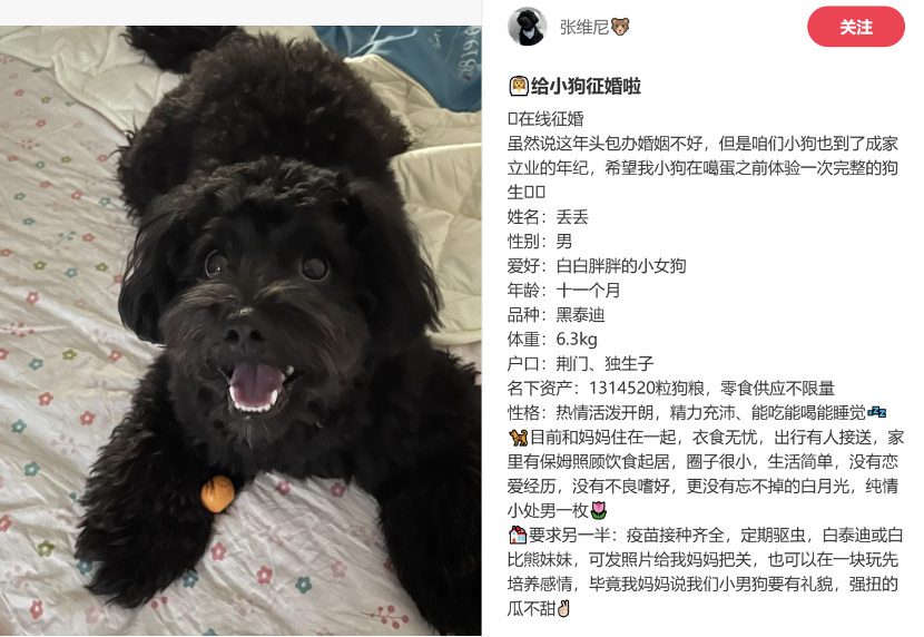 00后女生张维尼,在小红书上为自己的泰迪宠物狗发布了一则“在线征婚帖”。帖子中,她详细写明了宠物的姓名、性别、品种、爱好、户口,甚至还列出了“名下资产”。而在闲鱼、豆瓣等其他平台上,宠物主发布的各种五花八门、风格各异的宠物相亲帖子,共同组成了一个独特的“相亲角”。