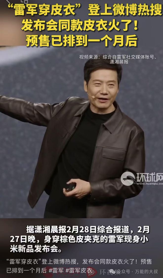 万万没想到,2月27日晚上,原本是一场“小米15 Ultra暨小米SU7 Ultra ”新品发布会,#雷军皮衣#、#雷军同款皮衣卖断货#却上了热搜……