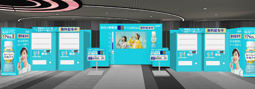 如春季的温差大,身体状况很容易受到影响,对此麒麟在涩谷推出了“免疫自动售货机”,并根据当天的温差来免费向人们提供不同数量的“美味的免疫护理”饮料。在2024年夏季,麒麟则在5个极端高温城市通过冰柜向人们提供“美味的免疫护理”,以此来提高人们对高温天气要注意免疫力的意识。