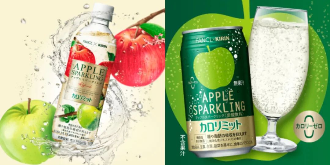 在与FANCL的合作中,麒麟则基于FANCL的子品牌カロリミット对于减脂成分的研究,推出了添加难消化糊精的苹果气泡酒和气泡水(难消化糊精具有抑制糖和脂肪吸收的功能)。